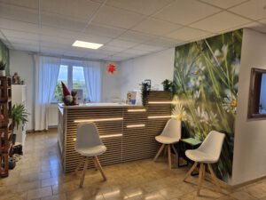 Neben unserem freundlichen Empfangs- und Wartebreich erwartet Sie eine moderne Praxis mit Therapieraum und -küche.