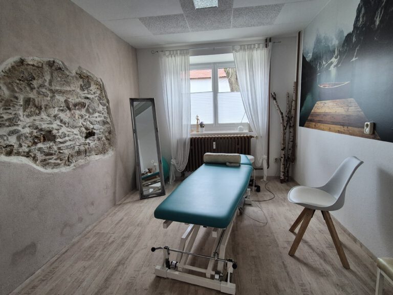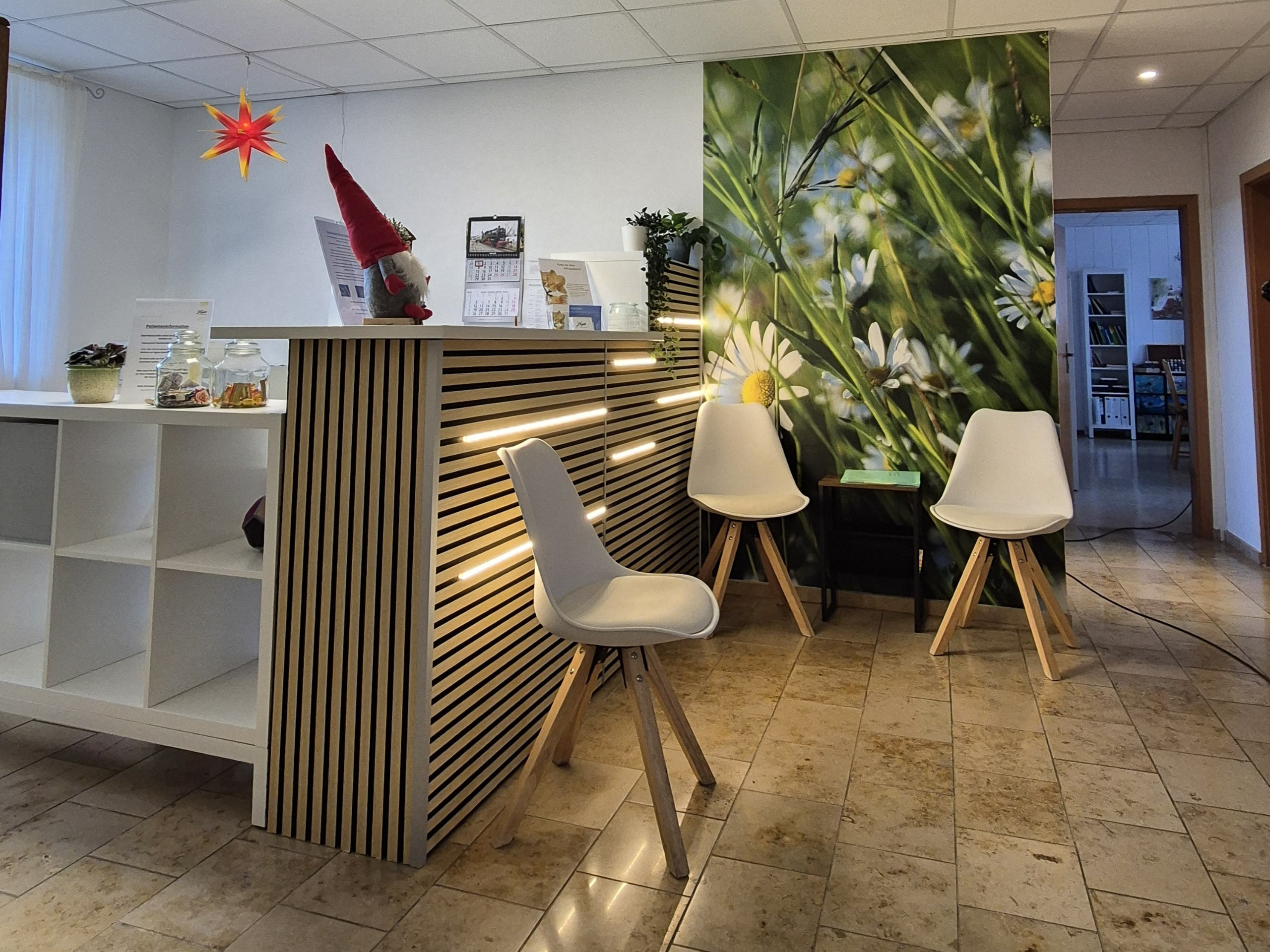 Neben unserem freundlichen Empfangs- und Wartebreich erwartet Sie eine moderne Praxis mit Therapieraum und -küche.